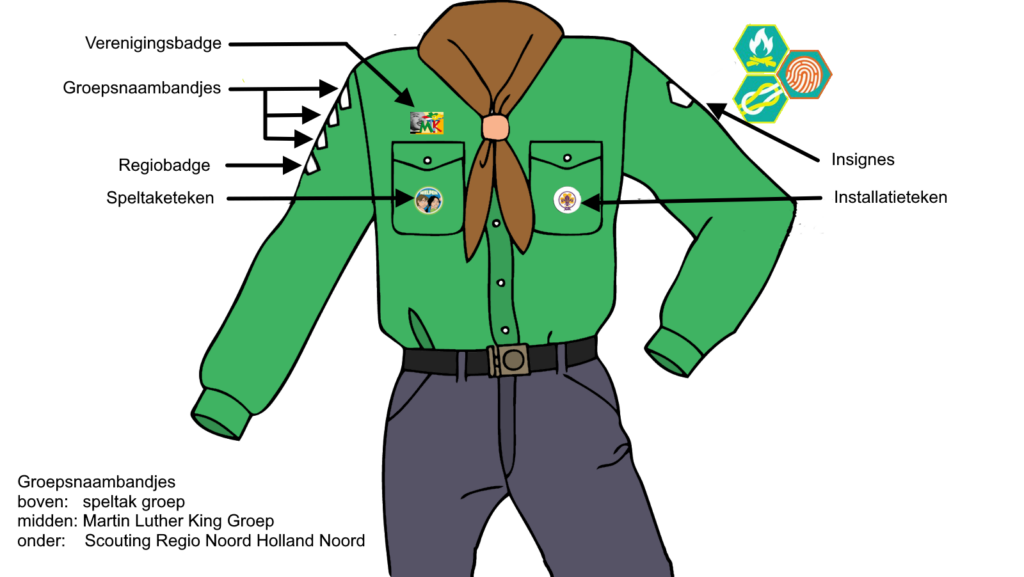 Iedereen bij Scouting draagt een scoutfit met daarop allerlei insignes en een das. Elke scoutinggroep heeft zijn eigen unieke das, zo ook wij! De das van Scouting Martin Luther King is donkergroen met een gele rand. Je krijgt de das wanneer je wordt geïnstalleerd.
